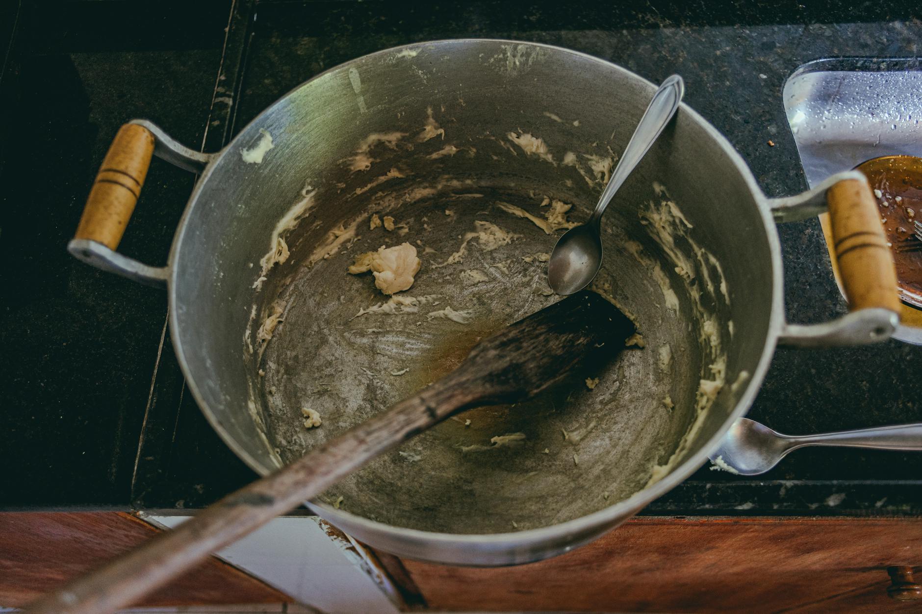 Strona główna Jak nie marnować jedzenia: kuchenne patenty na drugie życie resztek z lodówki Garnek z resztkami ciasta i kuchennymi przyborami widziany z góry